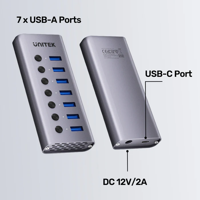 מפצל USB איכותי מבית UNITEK עם 7 יציאות USB 3.0 במהירות גבוהה, כולל מתגים אינדיווידואליים לכל יציאה, גוף אלומיניום עמיד וספק כוח חיצוני לעבודה יציבה גם בעומס מלא.