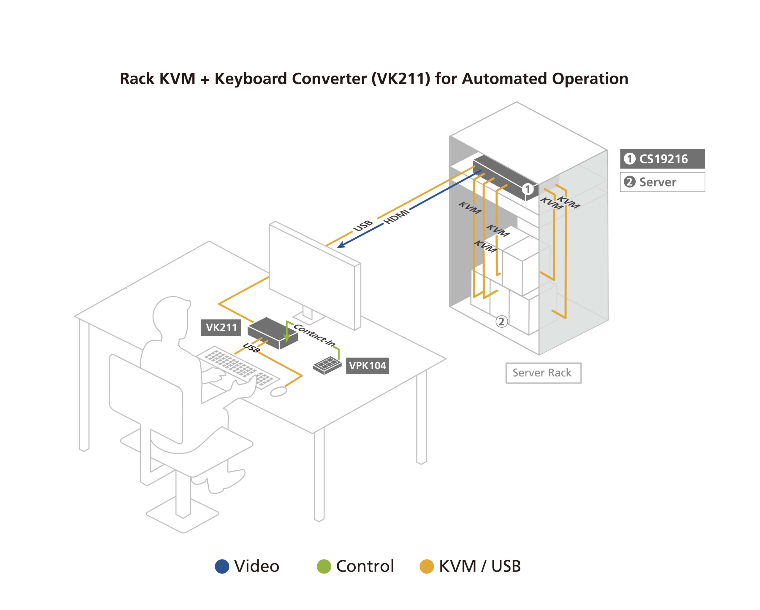 קופסת המיתוג ATEN CS19216 מאפשרת שליטה בעד 16 מחשבים שונים באמצעות מסך, מקלדת ועכבר יחידים.