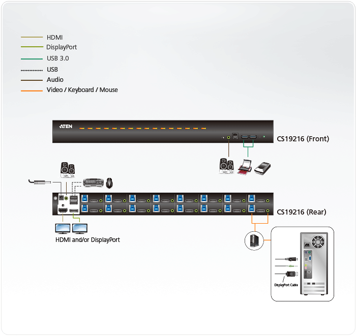 ATEN / CS19216 / DisplayPort / KVM Switch / USB 3.0 / 16 יציאות / 4K / Audio / DP KVM / מתג מיתוג / ציוד תקשורת / תמליל