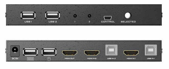 קופסת מיתוג KVM לחיבור 2 מחשבים לעמדת עבודה אחת שכוללת: מקלדת ועכבר USB וצג HDMI.